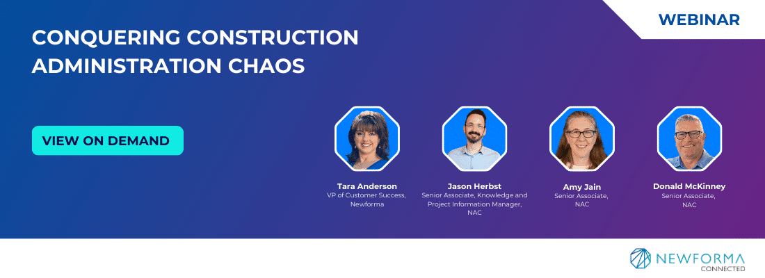 This discussion delves into the heart of Construction Administration (CA) complexities and explores actionable strategies to overcome them. Jason Herbst, Senior Associate | Knowledge and Project Information Manager at NAC, Donald McKinney, Senior Associate at NAC, and Tara Anderson, VP of Customer Success at Newforma will discuss how to solve the specific communication obstacles that plague the CA process. Join us for this informative webinar and embark on a journey to master the art of Construction Administration in today’s dynamic landscape.